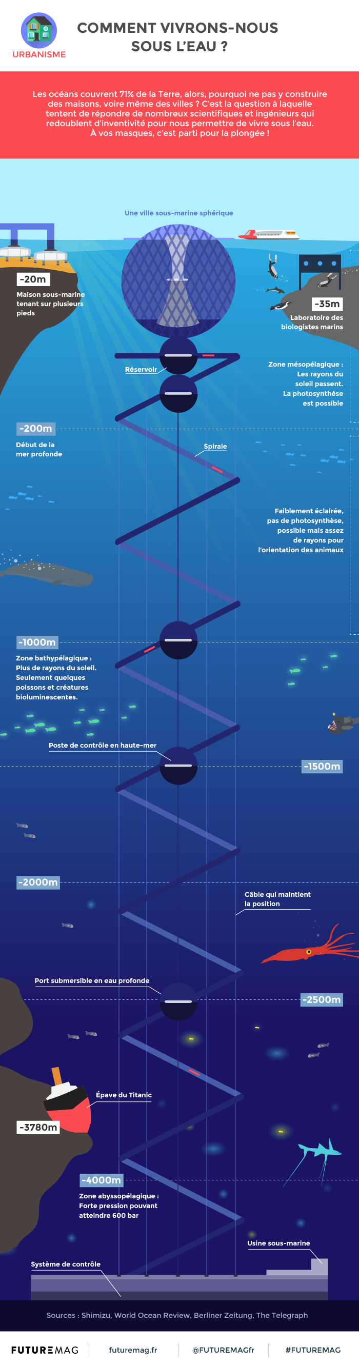 Alors que la COP21 de Paris a débouché sur un accord qui nous permet tout juste d’espérer éviter ce scénario catastrophe, ingénieurs, chercheurs et urbanistes explorent d’ores et déjà toutes les pistes nous permettant de pallier à cette montée des eaux en imaginant les villes de demain. Qu’elles soient flottantes ou… Sous l’eau. L’entreprise japonaise Shimizu a ainsi développé son projet de ville sous-marine « Blue Garden » et estime pouvoir le mener à bien à horizon 2030. L’infographie si dessous, réalisée par l’équipe de FutureMag explique le fonctionnement de ce projet un peu fou.
