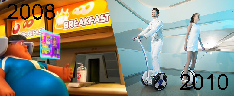 Le design s’éloigne aussi de la simple copie des films que nous avons pu voir. De nombreux films, comme le film d’animation Wall-E, montrent le futur de l’humanité comme des êtres peu actifs, se déplaçant et s’alimentant grâce à la technologie, ne faisant plus aucun effort physique. Fort heureusement, nous n’en sommes pas là. Mais on peut voir un lien fort entre ces films “catastrophes” et l’arrivée de nouveaux moyens de locomotion comme le Segway où aucun effort n’a besoin d’être fait. Serions-nous en train de nous rapprocher de ces dystopies en voulant suivre la science-fiction ?